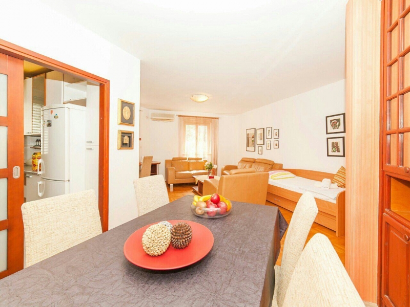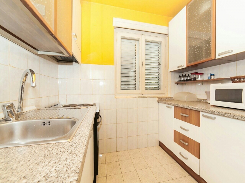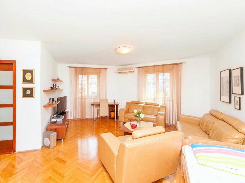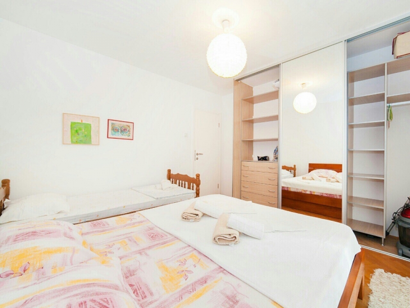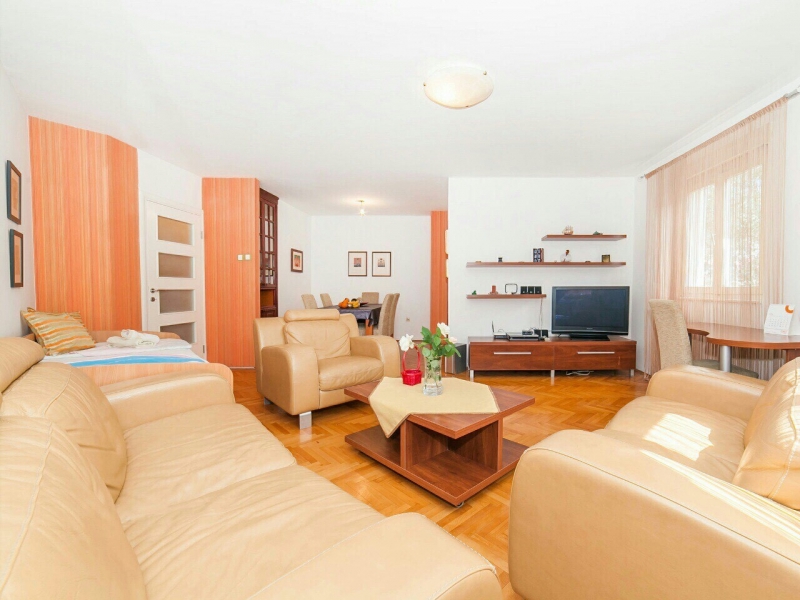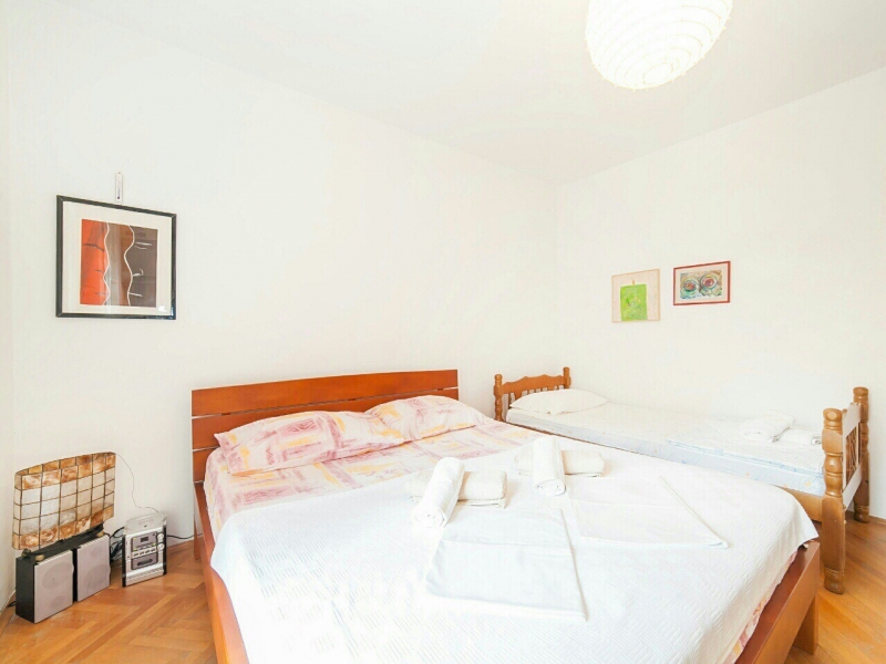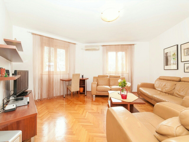 Stan ima 62m2 nalazi se na trecem spratu u zgradi sa liftom i sastoji se od: dnevne sobe, trpezarije, kuhinje, hodnika, spavace sobe, kupatia I terase. Opremljen je klima uredjajem, plazma tv i kablovkom tv, internet, masinom za ves, masinom za sudje, mikrotalanom, blin vrata, itd. U spavacoj sobi se nalazi francuski lezaj plus krevet za jednu osobu. U dnevnoj sobi se nalazi garnitura plus extra lezaj.