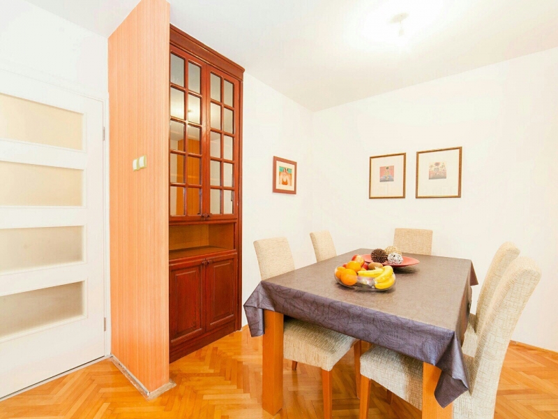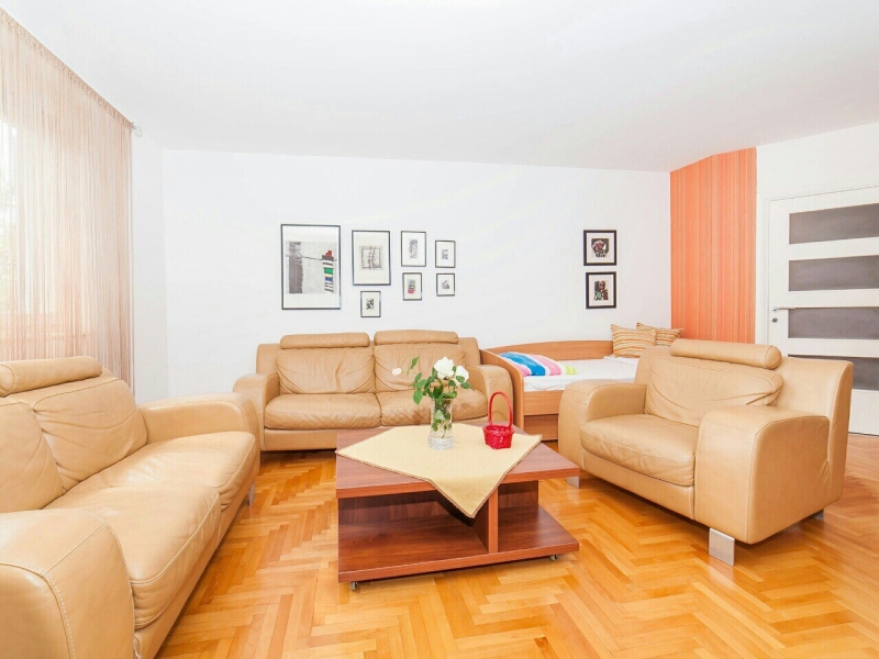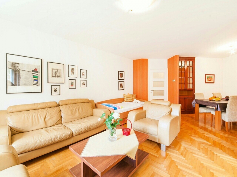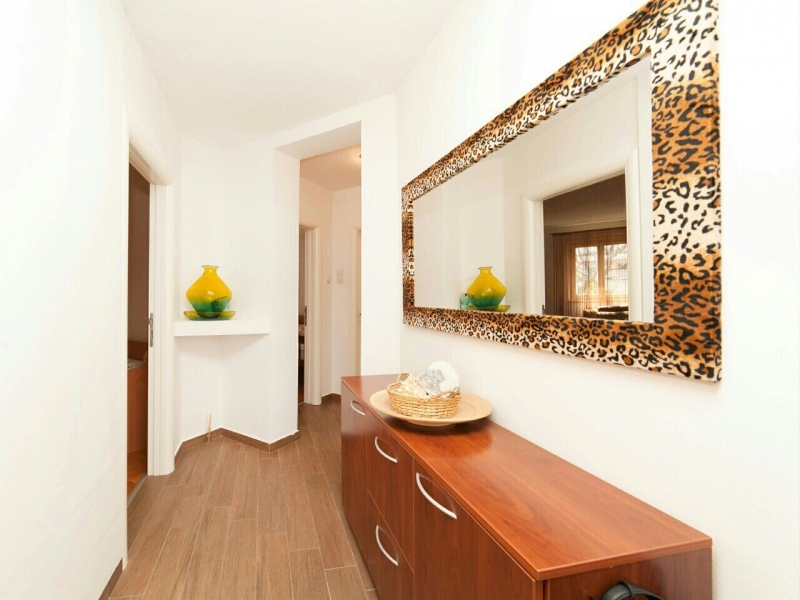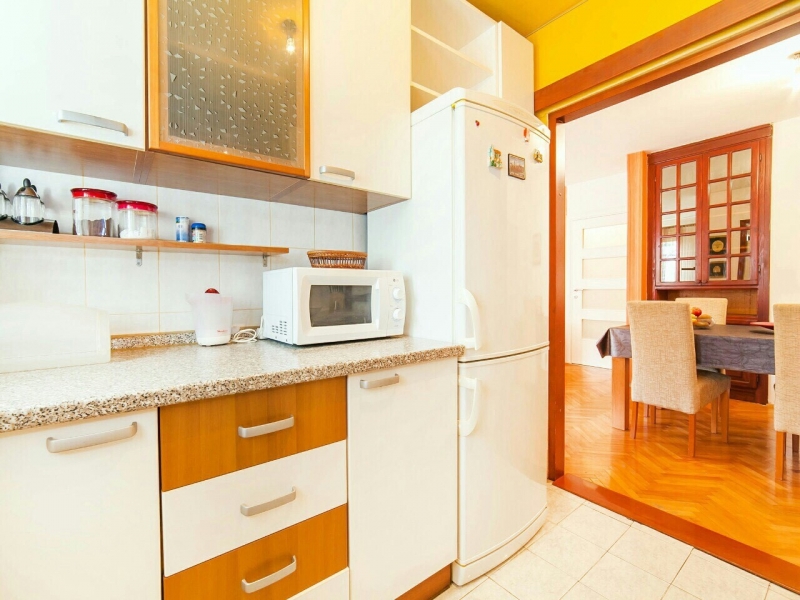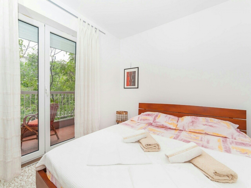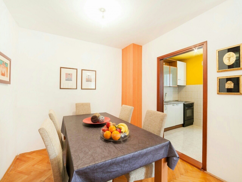 Stan ima 62m2 nalazi se na trecem spratu u zgradi sa liftom i sastoji se od: dnevne sobe, trpezarije, kuhinje, hodnika, spavace sobe, kupatia I terase. Opremljen je klima uredjajem, plazma tv i kablovkom tv, internet, masinom za ves, masinom za sudje, mikrotalanom, blin vrata, itd. U spavacoj sobi se nalazi francuski lezaj plus krevet za jednu osobu. U dnevnoj sobi se nalazi garnitura plus extra lezaj.