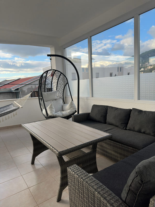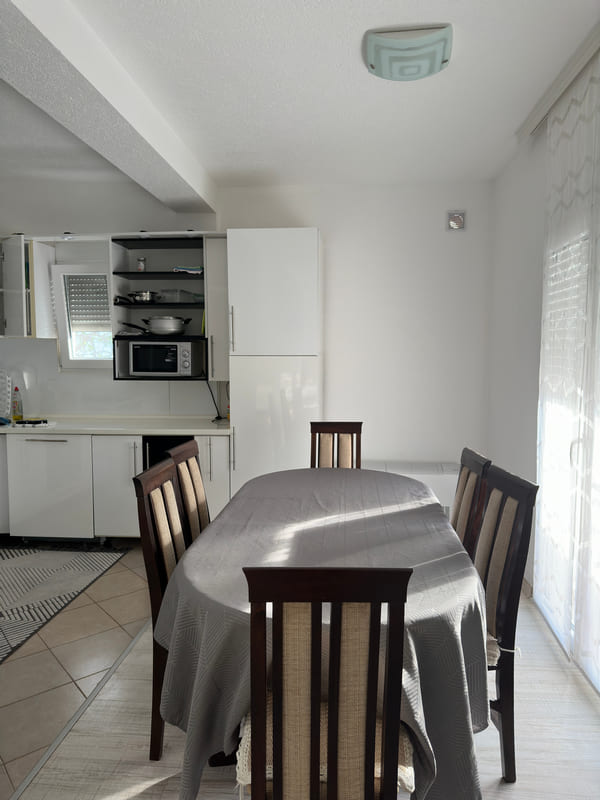U ponudi imamo apartman sa 4 spavaće sobe, velikim dnevnim boravkom i terasom. Kuhinjom potpuno opremljenom sa svim pratećim uređajima, kupatilom sa mašinom za veš i malim toaletom. Kapacitet ovog apartmana je 8 odraslih osoba ili 6 odraslih i 2 djece.