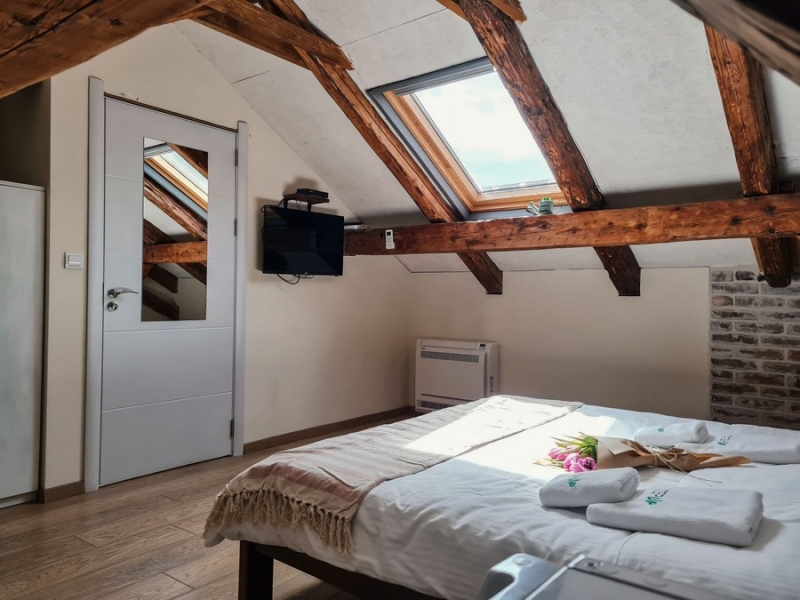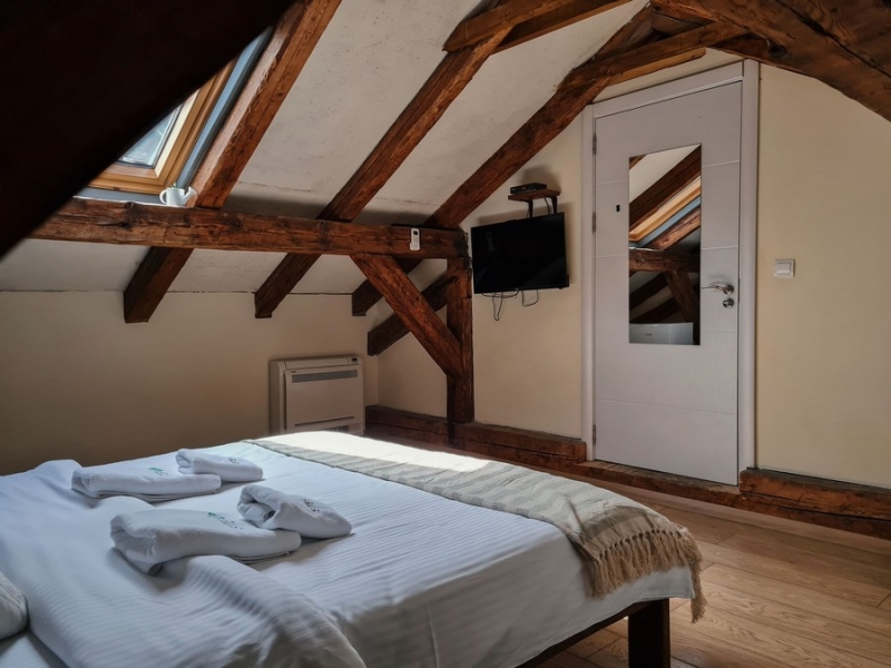 Površina prostorije: 25 m2Prostrana dvokrevetna soba u potkrovlju odiše romantikom i udobnošću. Soba ima TV, frižider i klima uređaj. Nalazi se na drugom spratu. U hodniku je zajednički toalet.