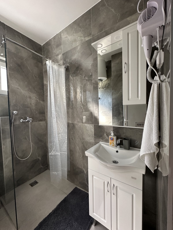 Kupaonica je odvojena i potpuno opremljena (tuš kabina, WC, fen za kosu, peškiri).