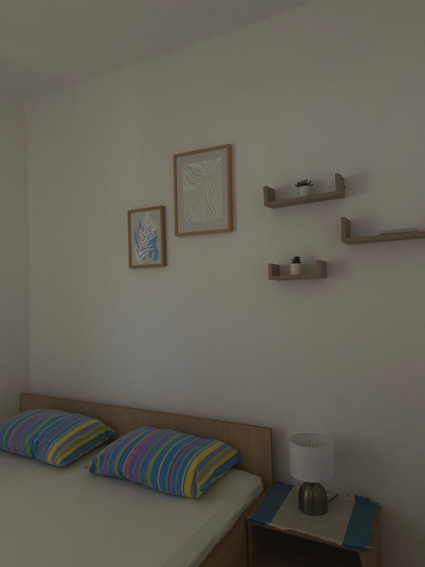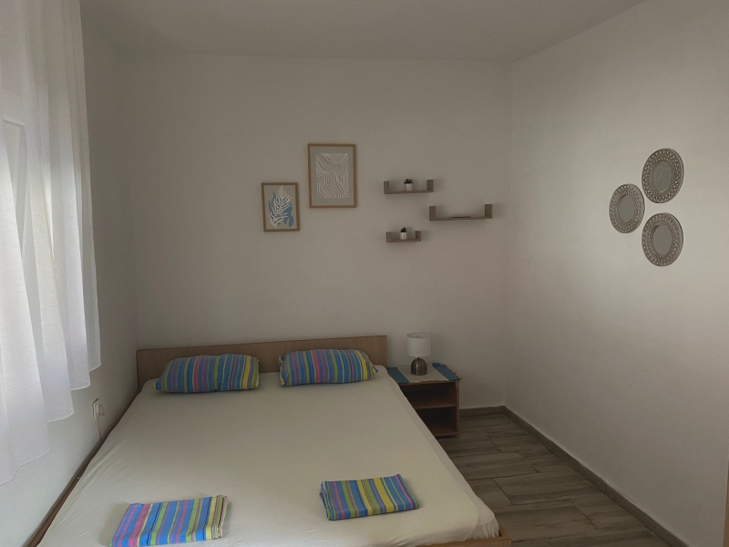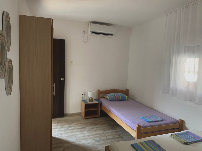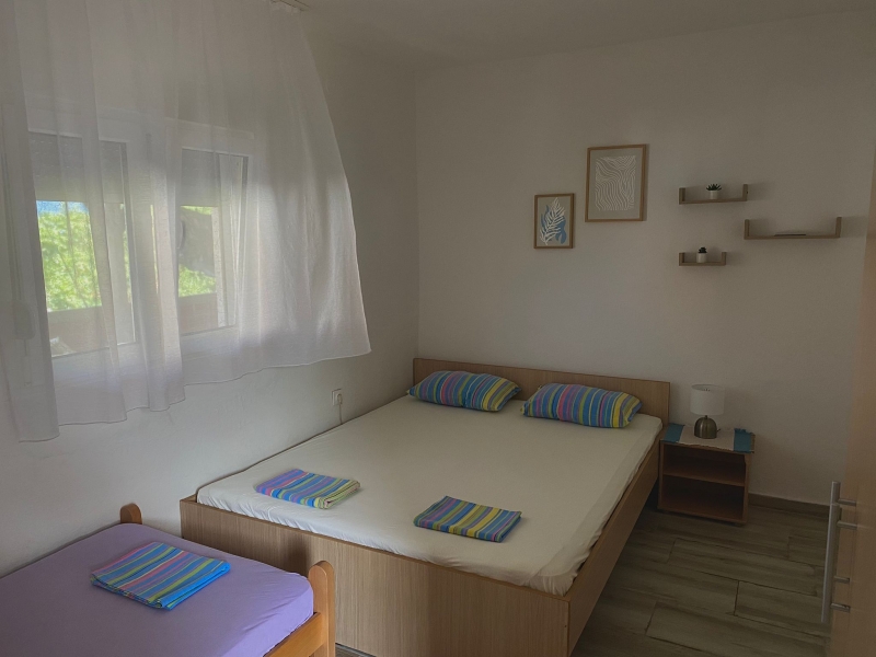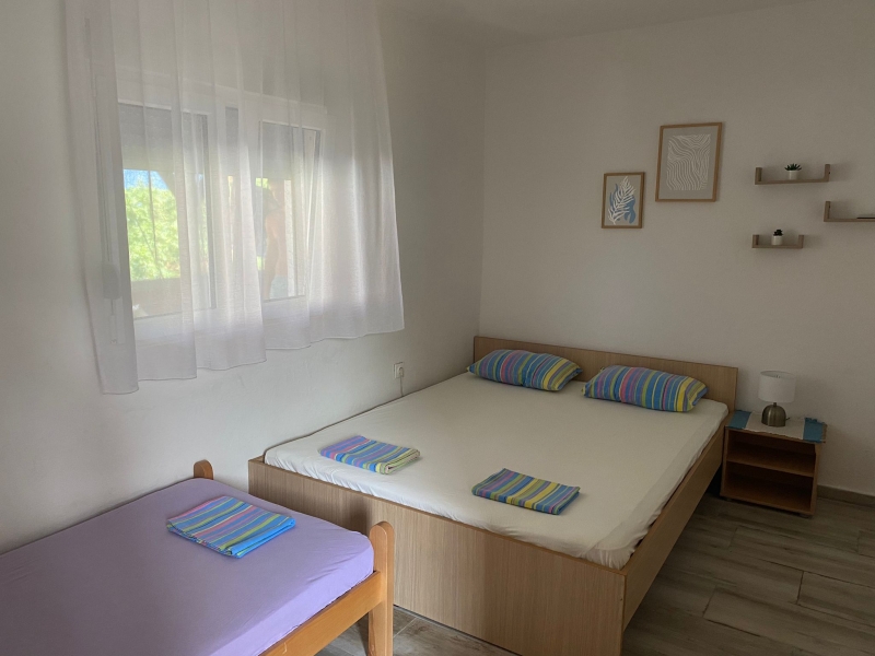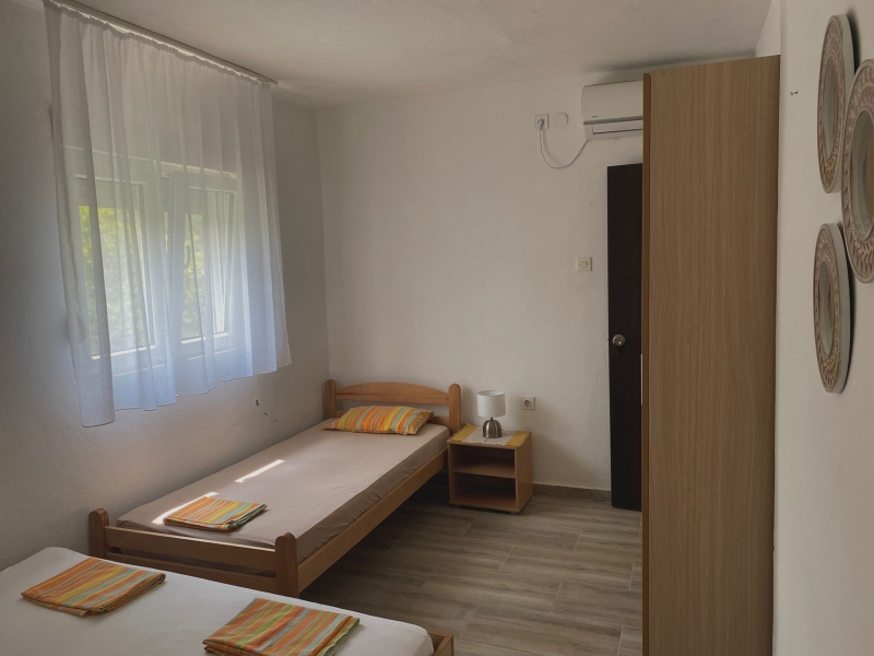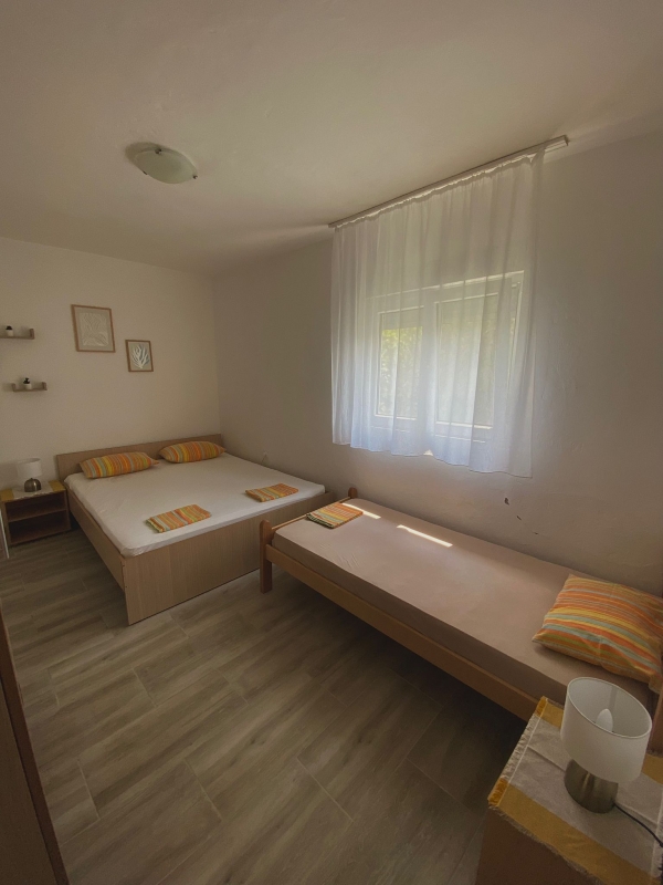 - Sprat: Apartman sa dve spavaće sobe (po bračni kreve i single krevet) + kuhinjica i kupatilo, natkrivena terasa. Maksimalni broj gostiju: 6