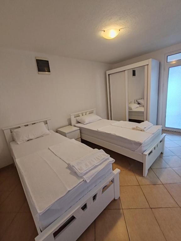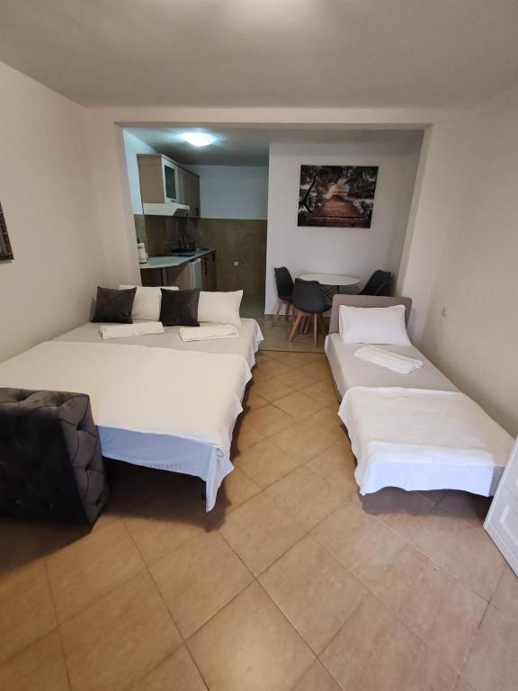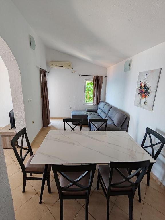 Površina prostorije: 105 m2Apartman sa 2 spavaće sobe i 2 sobe sa konfornim krevetima na razvlačenje za 4 osobe. Poseduje klimu i opremljenu kuhinju,. kupatilo. U apartmanu mogu boraviti najviše 8 osoba. Poseduje odličnu terasu za odmor, sa garniturom, stolom, suncobranima.